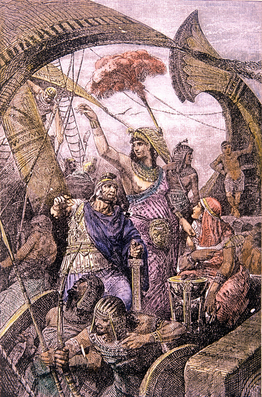 A nineteenth-century engraving shows the Egyptian queen Cleopatra at the great naval Battle of Actium in 31 BCE. The presence of women in the front line of battle has always been a rarity, and in reality Cleopatra fled from the scene of battle rather than stay and fight.