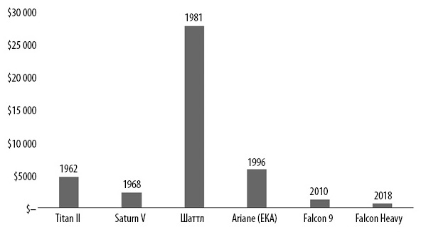 Рисунок 1. Стоимость вывода груза на околоземную орбиту (в долларах 2018 г. за фунт)