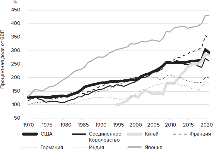 На рис 0.1 показано отношение общего долга к ВВП для стран «Большой экономической семерки» за период с 1970 по 2021 год. ВВП – это национальный доход и расходы, поэтому отношение долга к ВВП – это, по сути, отношение долга страны к ее доходу. Как высокое отношение долга к доходу вызывает беспокойство у какой-нибудь семьи, так и высокое отношение долга к ВВП, особенно долга частного сектора к ВВП, вызывает беспокойство в отношении экономики. Поразительной особенностью последних пятидесяти лет является неумолимый рост долга относительно ВВП для всех стран «Большой семерки».