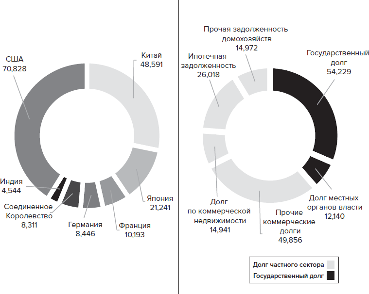 Мировой долг сконцентрирован всего в двух странах: США и Китае. Часть долга, приходящегося на частный сектор, в значительной степени состоит из долгов по недвижимости. На рис. 0.2 показаны относительные величины общего долга стран «Большой семерки», а также относительные виды задолженностей – государственный долг по сравнению с ключевыми категориями частного сектора, например коммерческими долгами и задолженностями домохозяйств[5].