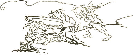 Of that billow-born broodBring me no tidings,For they have wooedTo my woeFull many a man to their caves.[Wotan stands silent, struggling with himself. The other Gods gaze at him in mute suspense. Fafner, meanwhile, has been consulting aside with Fasolt.