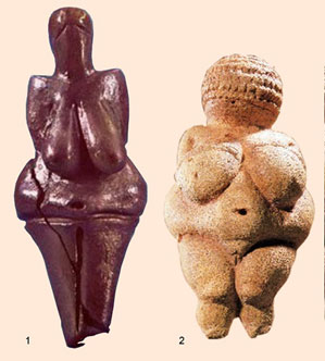 1. «Палеолитическая Венера», обнаруженная в Моравии. 2. «Венера» Виллендорфская. Обнаружена в Австрии. Музей естественной истории (Вена)