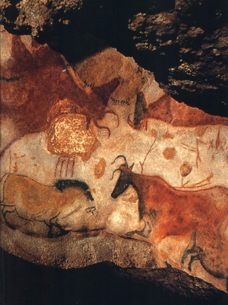 Как отмечалось, местом обитания в древнейшие времена могли служить пещеры, и здесь встречается еще одна древнейшая изобразительная форма – пещерная живопись. Она неплохо сохранилась, так как в пещерах тысячелетиями удерживались неизменными температура и влажность. Пещер с живописными изображениями обнаружено много, расположены они в Испании и Франции по обе стороны Пиренеев, а также в полосе, протянувшейся и сужающейся от этого «узла» к востоку. В России известна так называемая Капова пещера в Башкирии. Самая ранняя из известных – пещера Шове на юге Франции, старейшие рисунки в ней относятся к 34-му тысячелетию до н. э. (не все исследователи разделяют эту датировку). Наиболее знамениты пещеры Альтамира, Ласко, Ла Мадлен. Для примера рассмотрим росписи во французской пещере Ласко; в настоящее время она оборудована под музей. В нескольких ее залах и переходах на стенах и сводах можно видеть выполненные минеральными красками изображения коров, быков, антилоп (ил. 3).