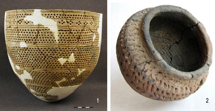 1. Тонкостенный сосуд, украшенный точечным орнаментом. Верхневолжская культура. Период неолита (кон. 6-го – кон. 5-го тыс. до н. э.). 2. Горшок со следами плетеного каркаса внутри. Северодонецкая культура