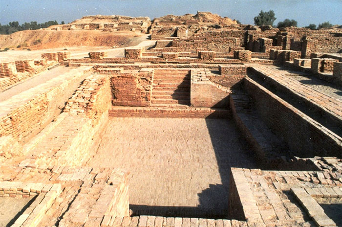 В качестве примера обычно рассматривается Мохенджо-Даро. Над городом возвышалась укрепленная цитадель. Внутри нее находились несколько сооружений, назначение которых определено предположительно. Во-первых, это ритуальный бассейн 12 × 7 м, глубиной 2,4 м (ил. 2).