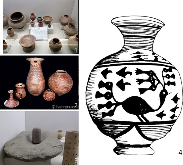 С разнообразными изделиями Хараппской цивилизации, которые могли присутствовать в индских интерьерах, знакомят нас материалы раскопок. Прежде всего, это всевозможные хозяйственные предметы. Керамические изделия выполнялись на гончарном круге (ил. 3.1–2) и порою украшались изображениями животных, птиц (ил. 3.4) и насекомых в окружении растительных или геометрических орнаментов.