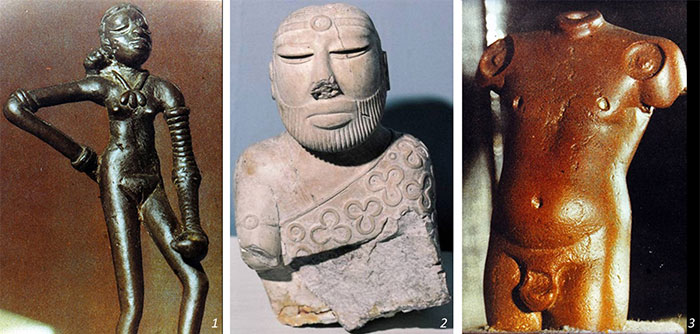 1. Танцовщица. Ок. 2300–1750 гг. до н. э. Бронза. 10,5 × 5 см. Национальный музей, Нью-Дели. 2. Жрец из Мохеджо-Даро. 2000–1900 гг. до н. э. Стеатит. 17,5 × 11 см. Национальный музей Пакистана, Карачи. 3. Мужской торс с двойной парой рук. Красный песчаник