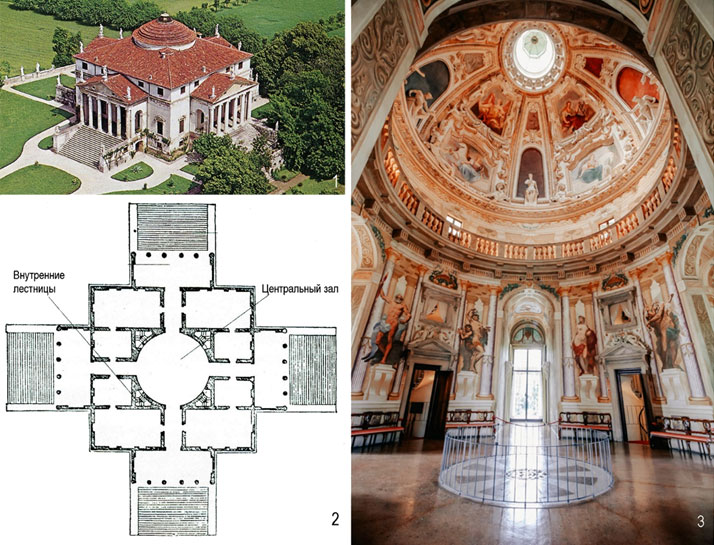Знаменитым сооружением Палладио является так называемая Вилла Ротонда (1550–1552 гг.), названная так по круглому залу (ротонде), расположенному в центре и перекрытому куполом (ил. 6.1).