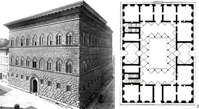 1.1. Снаружи (ил. 7.1) палаццо раннего Ренессанса напоминает преображенный упорядоченный замок, правда, без увенчивавших стены крепостных зубцов (хотя в раннем периоде Ренессанса они еще появляются). Наружные стены по-прежнему мощные, выложены из крупных каменных блоков, но в ренессансном палаццо неправильная средневековая кладка превратилась в правильную, регулярную, с глубокими швами, представлена рустом.