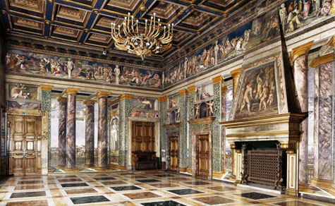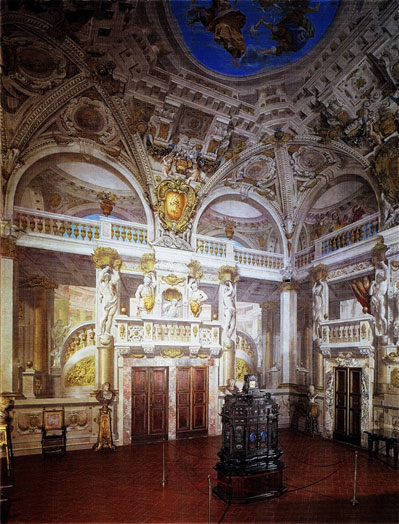 4.2. Помещения в палаццо преувеличенно большие, царственно величавые. Внутреннее пространство комнат, соотношения в них сторон, площадей и высоты решалось по тем же правилам, что и в новых ренессансных домах. Как и там, комнаты выстраивались анфиладами.