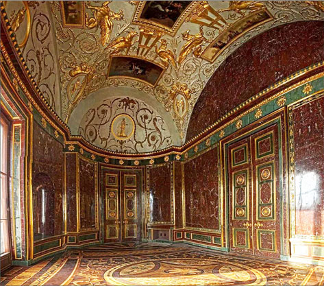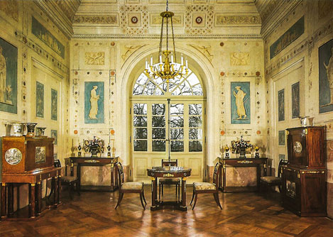 Стены в этих интерьерах оказывались отнюдь не светлыми, что вовсе не характерно для классицизма, но масштаб, ясное архитектурное построение, симметрия и регулярность на всех уровнях, безупречные пропорции и сдержанность в использовании декора сполна уравновешивают цветовую интенсивность полудрагоценной облицовки.
