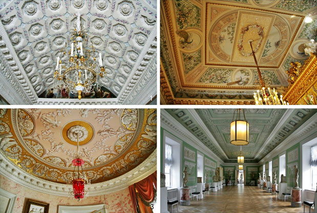 Украшением потолков классицизма могли также стать декоративные композиции с лепными деталями (см. ил. 24.3), с живописными вставками, либо сочетания рельефных групп и небольших живописных вставок. Мотивы – кассеты, розетки, гирлянды с бантами и т. д. и т. п.