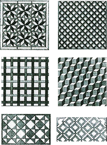 В симметричных использовались общие для классицистических интерьеров принципы с фиксированным центром. Уже отмечалось, что композиционное решение пола нередко соотносилось с решением потолка. Как и в случае потолочной композиции, во-первых, привлекались правильные формы прямоугольника и круга и, во-вторых, выдерживалась строгая классицистическая иерархия: переход от общего к частному и далее к новому частному, при этом на каждом уровне подчеркивается значение каждого композиционного компонента. Т. е. выделялся центр и симметричные фрагменты по его сторонам; каждый элемент композиции пола графически очерчен, а сами фрагменты заполнены разнообразными геометрическими фигурами – прямоугольниками, квадратами, кругами, восьмигранниками, звездами и т. д. (см. ил. 13; 22; 25).