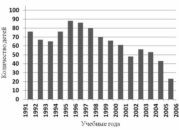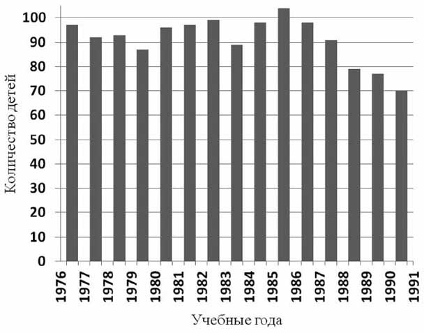 Главные герои книги – дети. На основании трех «Книг учета воспитанников» с 1945 по 2006 год составлен «Список воспитанников по годам рождения» (см. Приложение). Всего он включает 1693 ребенка. Около двух десятков детей последних десятилетий вообще не были записаны в Книгах: их имена восстанавливали с помощью бывших воспитателей. На основании этого Списка составлена гистограмма, наглядно демонстрирующая количество детей в детдоме по учебным годам. Начало учебного года считаем с 1 сентября. Летом могло жить больше детей, т. к. еще не уехали выпускники текущего года, а новое пополнение уже приехало. В текущем учебном году не учитывались дети, которые приехали после нового года до конца мая, но таких совсем немного.