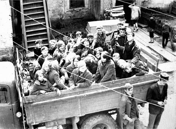 Сборы на экскурсию в лес. В первом ряду: Валера Веревкин, Таня Солохина. Во втором ряду: Стасик Казаков, Слава Устинов, Ольга Ануварова, Валя Шилова, девочка в платке – не идентифицирована. В третьем ряду: Вася Мальцев, Таня Кирпичникова, Люда Устинова, Люба Шистирова, Оля Женихова, Лена Новикова. В четвертом ряду: Вова Ширяев, Коля Антипин, воспитанник перед ним – не идентифицирован, Рая Хакимова, Марина Бородулина. В пятом ряду: Вася Шилов, Сережа Чикунов, Шамиль Аширов, неидентифицированный воспитанник, Юра Анпалов, Алеша Белянкин, Боря Мартынов, Саша Крылов. Возле кухни – Лена Дудник. Не удалось установить, кто держит метлу