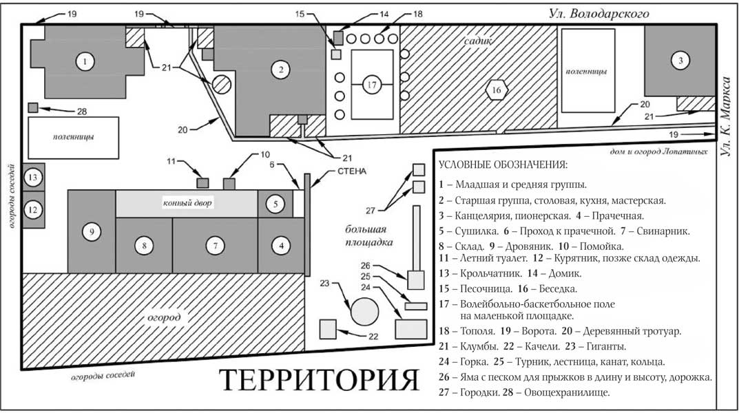 Двор нашего детского дома назывался «ТЕРРИТОРИЕЙ», ему я пою отдельную песню, без него трудно представить нашу жизнь. Его размеру и содержанию могли позавидовать многие. Есть где размахнуться для игр, реализовать свои фантазии. То был свой мирок со многими возможностями и практически полностью защищенный от внешних факторов. Тесно для примерно 90 человек не было. Каждый находил занятие по душе.