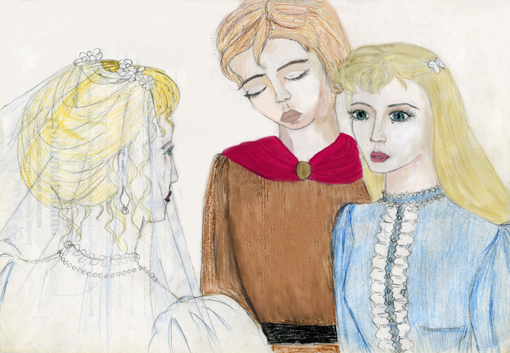 Пара развернулась и стала покидать храм под ликующие крики гостей свадьбы. Наследница престола, облачённая в неброское голубое платье, подняла ресницы и вгляделась в личико невесты. Вернее, жены… Она оказалась совсем ребёнком, тоненькой девочкой лет 16, не более, в глазах которой застыл страх. Едва новобрачные поравнялись с переодетой принцессой и её рыцарем, невеста заметила молодую незнакомую пару. Её взгляд скользнул по лицу наследницы. В глазах Ирены стояли слёзы. Девушка отрицательно покачала головой. Невеста, понимая её без слов, прикрыла веки в знак того, что приняла сочувствие незнакомки.