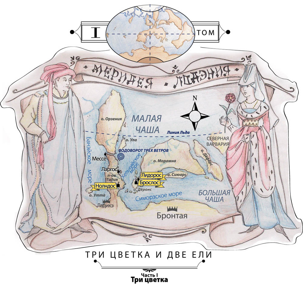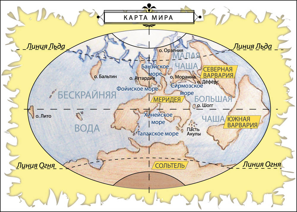 Принадлежит этот мир прошлому нашей планеты или будущему – неизвестно и несущественно. Он ограничен Линией Льда на севере и Линией Огня на юге и состоит из четырех континентов: Меридеи, Южной Варварии, Северной Варварии и Сольтеля – самого южного и жаркого материка. Живущие в Меридее люди называют себя мериде́йцами, верующие – меридиа́нцами; о трех других континентах меридейцы имеют смутное представление, щедро приправленное домыслами и небылицами.