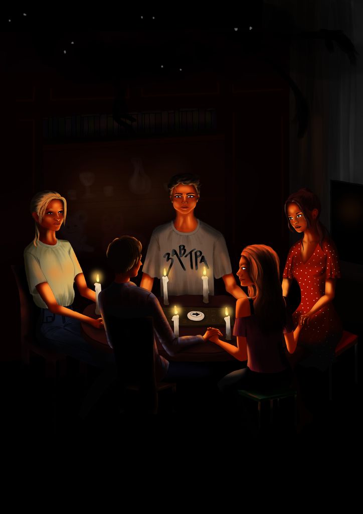 Наконец, всё было готово, свет потушен, и комната погрузилась в полумрак. Мы все уселись вокруг стола и положили пальцы на блюдце. Влад всё делал с таким видом, словно с духами у него официальные переговоры, от которых зависит судьба мира. Он положил найденную мной брошь на стол и тоже докоснулся до блюдца.