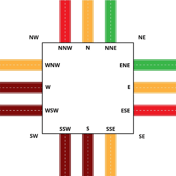 Участок с направлением на трассу с востока или с севера считается хорошим для многих областей жизни. Участок с направлением на трассу с запада (вход в участок с запада), может принести известность и популярность. Участок с направлением на трассу с юга подходит для бизнеса.