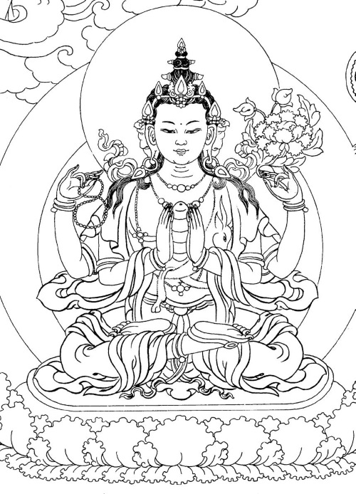 Теперь из этой пустоты вы снова возникаете в форме Ченрези – с одним лицом и только двумя руками. Думайте, что его тело – союз формы и пустоты, его речь – союз звука и пустоты, а его ум – союз сознания и пустоты. Наконец вы посвящаете заслуги, накопленные выполнением этой практики.