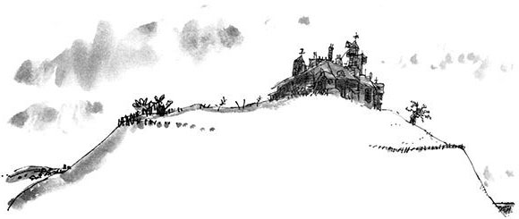 Жили они – тетя Пика, тетя Плюха, ну а теперь еще и Джеймс с ними вместе – в нескладной такой развалюхе на вершине высокого холма на юге Англии. Холм был до того высокий, что почти с любого места в саду открывался вид на живописные леса и поля. А в особенно ясную погоду, если смотреть в точности туда, куда нужно, Джеймс различал крошечную точечку на горизонте – и это был тот самый дом, где он раньше жил со своими дорогими родителями. А прямо за этой точечкой он видел море – длинную тоненькую темно-синюю полоску, как чернилами выведенную по самому краю неба.