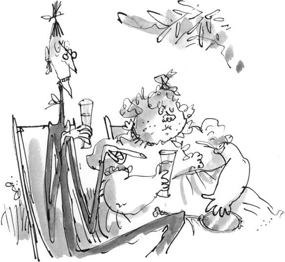 Тетя Плюха была низенькая и до невозможности толстая. У нее были крошечные свиные глазки, рот жирным бантиком, а лицо такое белое и пухлое, как будто его слишком долго варили и переварили. И вся она была как громадный, белый, вялый, переваренный кочан капусты. Тетя Пика, наоборот, была тонкая, длинная и костлявая, и она носила очки в стальной оправе, закрепляя их зажимом на кончике носа. Голос у нее был скрипучий, рот длинный, узкий, и стоило ей разозлиться или разволноваться, она начинала при каждом слове брызгать слюной. И вот две эти кошмарнейшие карги сидели, потягивали лимонад и то и дело покрикивали на Джеймса, чтобы он живее, живее, живее колол щепки. А еще они рассказывали друг дружке о себе, и каждая говорила о том, как она прекрасна. Тетя Плюха держала на коленях зеркальце с длинной ручкой и то и дело поднимала его к глазам и разглядывала свою отвратительную физиономию.