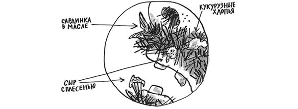 Но если бы вы всё-таки решились приглядеться ещё лучше (зажимайте, граждане, носы!), если бы вы проявили настойчивость и вгляделись в жёсткую щетину над его верхней губой, то увидели бы куски покрупнее, избежавшие смахивания, – остатки пищи, которые пробыли там долгие месяцы. Такие как кусочек зелёного заплесневелого сыра или парочка подгнивших кукурузных хлопьев, или даже склизкий хвостик сардины в масле.