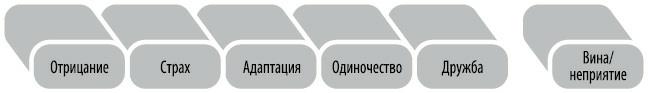 Процесс адаптации для бросившего и брошенного проходит по-разному, поскольку поведение бросившего в большей степени определяется чувством вины, а поведение брошенного – чувством отвергнутости. Пока мы на семинаре не обсудили эту тему, Дик считал, что его отношения закончились взаимно. Он пошел домой, думая об этом, и наконец признался себе, что его бросили. Сначала он очень рассердился. Потом начал осознавать свое чувство отверженности и понял, что надо справиться с ним, прежде чем он сможет продолжать восхождение.
