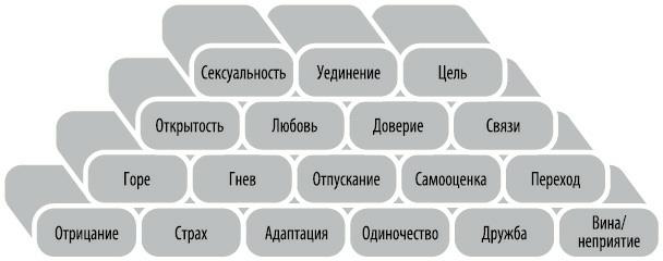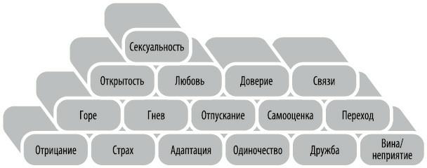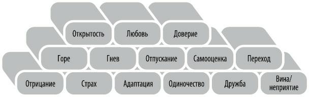 Модель восстановительных блоков графически представляет 19 особых чувств и установок, сложенных в форме пирамиды, символизирующей гору, на которую нужно забраться. Процесс принятия может быть таким же трудным путешествием, как и восхождение на гору. Поначалу задание кажется невыполнимым. Откуда начать? Как забираться? Будет ли у нас проводник с картой, чтобы помочь нам забраться на эту неприступную гору? Для этого и нужны восстановительные блоки: это проводник и карта, приготовленные другими, уже прошедшими этот путь.