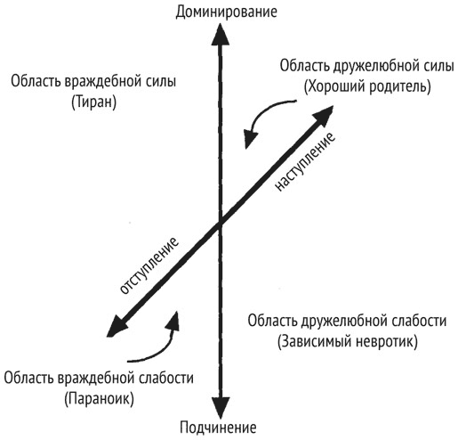 Сетка первого и второго контуров образует четыре квадранта. Заметьте, что Враждебная Сила (тиран) склонна к параноидальной замкнутости; он должен править, но он также боится. Вспомните Гитлера, Сталина, Говарда Хьюза и др., а также недоступный Замок и Суд в аллегориях Кафки. Заметьте также, что зависимый невротик находится совсем не в области отступления; он наступает на вас, требуя удовлетворения его эмоциональных «нужд» (импринтов)
