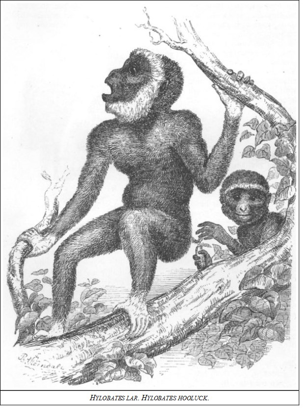GENUS HYLOBATES—THE GIBBONS,Which, with the long arms of the Ourangs and the receding forehead of the Chimpanzee, possess the callosities of the true monkeys, but differ from them in having neither tail nor cheek pouches. They are true bipeds on the ground, applying the sole of the foot flatly, not, as Cuvier and others have remarked of the Ourangs, with the outer edge of the sole only, but flat down, as Blyth, who first mentions it, noticed it, with the thumb or big toe widely separated.
