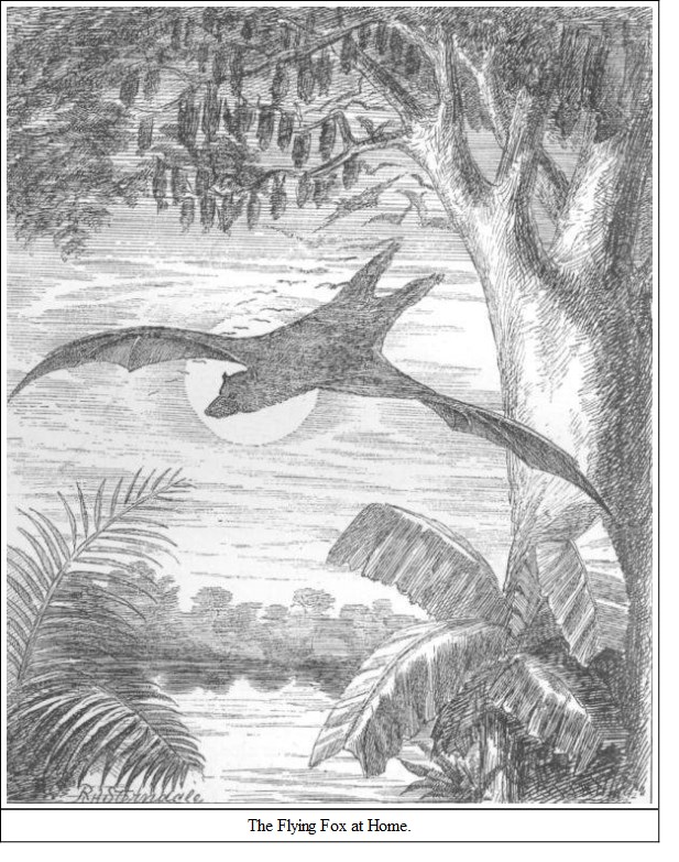 Tickell's account of these colonies is most graphic, though Emerson Tennent has also given a most interesting and correct account of their habits. The former writes:—"From the arrival of the first comer until the sun is high above the horizon, a scene of incessant wrangling and contention is enacted among them, as each endeavours to secure a higher and better place, or to eject a neighbour from too close vicinage. In these struggles the bats hook themselves along the branches, scrambling about hand over hand with some speed, biting each other severely, striking out with the long claw of the thumb, shrieking and cackling without intermission. Each new arrival is compelled to fly several times round the tree, being threatened from all points, and, when he eventually hooks on, he has to go through a series of combats, and be probably ejected two or three times before he makes good his tenure." For faithful portraying, no one could improve on this description. These bats are exceeding strong on the wing. I was aware that they went long distances in search of food, but I was not aware of the power they had for sustained flight till the year 1869, when, on my way to England on furlough, I discovered a large flying fox winging his way towards our vessel, which was at that time more than two hundred miles from land. Exhausted, it clung on to the fore-yard arm; and a present of a rupee induced a Lascar to go aloft and seize it, which he did after several attempts. The voracity with which it attacked some plantains showed that it had been for some time deprived of food, probably having been blown off shore by high winds. Hanging head-downwards from its cage, it stuffed the fruit into its cheeks, monkey-fashion, and then seemed to chew it at leisure. When I left the steamer at Suez it remained in the captain's possession, and seemed to be tame and reconciled to its imprisonment, tempered by a surfeit of plantains. In flying over water they frequently dip down to touch the surface. Jerdon was in doubt whether they did this to drink or not, but McMaster feels sure that they do this in order to drink, and that the habit is not peculiar to the Pteropodidæ, as he has noticed other bats doing the same. Colonel Sykes states that he "can personally testify that their flesh is delicate and without disagreeable flavour;" and another colonel of my acquaintance once regaled his friends on some flying fox cutlets, which were pronounced "not bad." Dr. Day accuses these bats of intemperate habits; drinking the toddy from the earthen pots on the cocoanut trees, and flying home intoxicated. The wild almond is a favourite fruit.