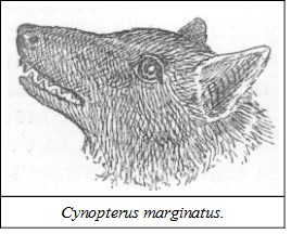GENUS CYNOPTERUSThis genus has four molars less than the last, a shorter muzzle; the cheek-bones or zygomatic arch more projecting; tongue rather longer and more tapering, and slightly extensile.