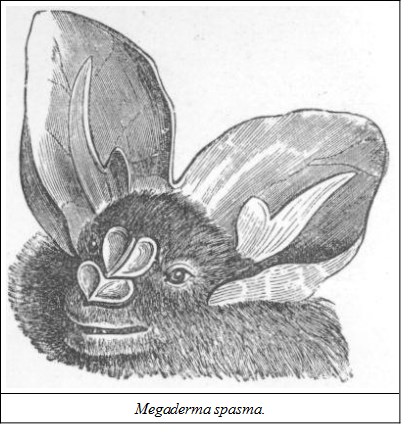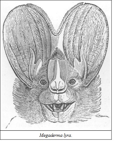 MICROCHIROPTERASUB-FAMILY VAMPYRIDÆGENUS MEGADERMABats with simple or complicated nose-leaves or membranes. The conch of the ear very large, and joined together on the top of the head; tragus large and bifurcated; nasal membranes complicated; no tail; wings remarkably ample. They have four incisors below but none above, the intermaxillaries remaining cartilaginous.