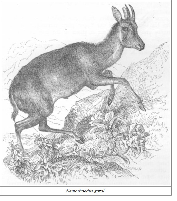 GENUS NEMORHOEDUS"Horns in both sexes round, black and ringed; a small muffle; eye-pits wanting or small; large feet-pits in all feet; no inguinal pits nor calcic tufts; tails short, hairy; four mammæ" (Jerdon).