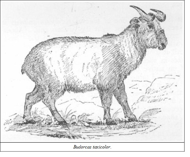 I must here include one of the most curious animals in India, a creature resembling at first sight the African gnu. About a couple of years ago, a friend of mine, who hails from the "land o' cakes," called to ask me about a strange animal he had noticed in the Museum. "They call it a 'takin,'" said he; "and if I did not think they were above jokes in such a dry-bone establishment, I should say in the language of my native country, that it is a 'tak' in,' for it does not look natural at all." I turned up Hodgson's account of the creature for him, to prove that it was not a hoax. It was first brought to notice by the above naturalist about thirty years ago, and he gave it the name Budorcas, from the two Greek words signifying ox and gazelle.