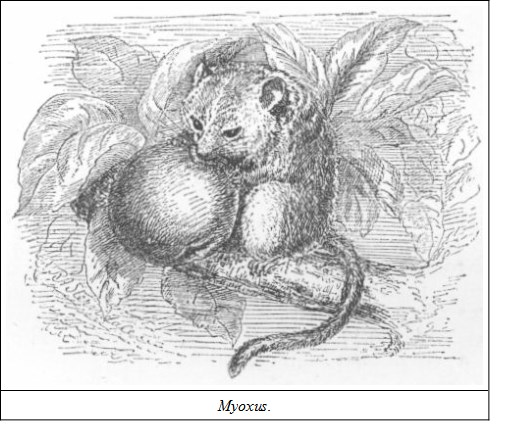 FAMILY MYOXIDÆ—THE DORMICEThese small rodents approximate more to the squirrels than the true mice; but they differ from all others intestinally by the absence of a cæcum. They have four rooted molars in each upper and lower jaw, the first of each set being smaller than the other three, the crowns being composed of transverse ridges of enamel. In form they are somewhat squirrel-like, with short fore-limbs, and hairy, though not bushy, tails. The thumb is rudimentary, with a small, flat nail; hind-feet with five toes.