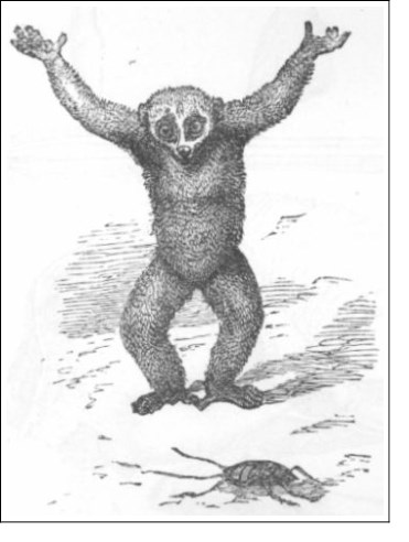 The Slow Loris, No. 28 .—This creature sometimes assumes the erect posture, though in general it creeps. The following illustration shows an attitude observed and sketched by Captain Tickell, as the animal was about to seize a cockroach. When it had approached within ten or twelve inches, it drew its hind feet gradually forward until almost under its chest; it then cautiously and slowly raised itself up into a standing position, balancing itself awkwardly with its uplifted arms; and then, to his astonishment, flung itself, not upon the insect, which was off "like an arrow from a Tartar's bow," but on the spot which it had, half a second before, tenanted.