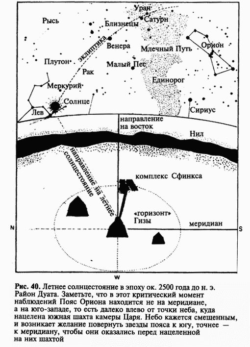 Мы уже видели, что сущностью этого святого «царства Осириса» был некий специфический дуализм, связывающий его с участком неба под названием Дуат, расположенным вблизи Ориона и Сириуса на западном «берегу» Млечного Пути. Мы также видели, что центр Дуата назывался Ростау и существовал тоже в двух измерениях – космическом и земном: на небесах он обозначался тремя звездами Пояса Ориона, а на земле – тремя пирамидами Гизы. И, наконец (но не в последнюю очередь), мы видели, что древние египтяне эпохи Пирамид особое значение придавали Дуату в тот момент, когда он находился на востоке вблизи предрассветного горизонта во время летнего солнцестояния.