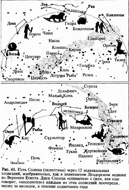 Среди важных характеристик Ра Дэвид выделяет объявление его богом Ра-Горахти. Поскольку точное значение слова Горахти — Гор Горизонта, то, похоже, в этом последнем примере древнеегипетского синкретизма наблюдается слияние солнечного диска с божеством. Далее, как хорошо знают астрономы и астрологи, диск солнца в самом деле «сливается» с (или «входит в дом») определенными группами звезд – двенадцатью зодиакальными созвездиями через равномерные промежутки времени в течение года. Поэтому представляется разумным предположить, не является ли Гор Горизонта, то есть Горахти, одним из этих зодиакальных созвездий.