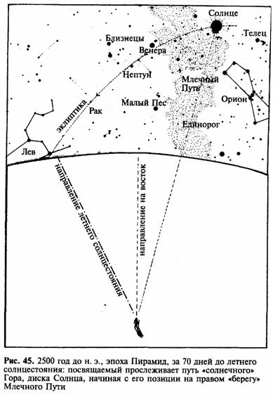 Отсюда следует, что нас приглашают выяснить, где же находился небесный собрат Гора-царя, то есть диск солнца, за 70 дней до гелиакального восхода Сириуса. И снова ключ к ответу дают нам «Тексты Пирамид». В них говорится: в это время Гор – солнечный Царь – находился на берегу Млечного Пути и собирался садиться на солнечный корабль. Попробуем расшифровать эту картину при помощи компьютерного моделирования, не забывая, что упоминаемые в текстах астрономические наблюдения производились в середине III тысячелетия до н. э.