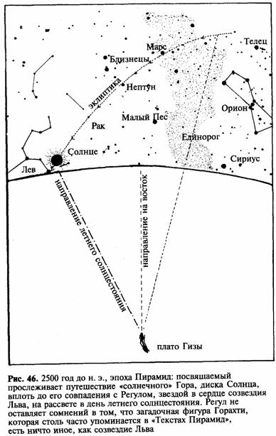 Как «сын Осириса» он появлялся из «чрева Исиды», то есть звезды Сириус, на рассвете в день летнего солнцестояния, то есть вдень рождения Ра. Именно там и тогда, на обоих горизонтах, Гор-царь должен был оказаться перед входными воротами Ростау. Там, у ворот земного «горизонта», то есть Гизы, он должен был встретить охраняющую их фигуру гигантского льва – Великого Сфинкса. А кого же должен был встретить на страже небесного горизонта его небесный собрат?