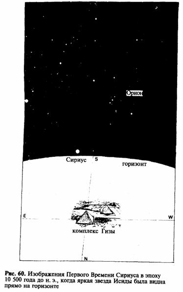 Если принять во внимание одновременно эффекты прецессии и это достаточно заметное и быстрое движение, то компьютерная имитация выявляет довольно интересную картину. Расчеты показывают, что когда Сириус пребывал в своем Первом Времени, то есть находился в наинизшем положении над горизонтом, наблюдатели на широте Гизы (30° северной широты) должны были видеть его точно на горизонте. Более того, именно на этой широте, и только на ней, можно было наблюдать такое взаимное расположение этой звезды и горизонта114 . Отсюда вытекает, что существует особая связь между широтой Гизы и Сириусом в его Первом Времени.