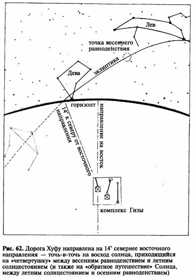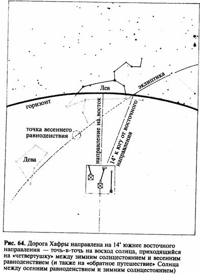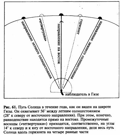 Если наблюдать восход солнца на широте Гизы систематически в течение года, то ответ на этот вопрос становится очевидным. Здесь, как и везде на нашей планете, в день весеннего равноденствия солнце восходит точно на востоке; так направлена дорога, ведущая к пирамиде Менкаура, в этом направлении смотрит Сфинкс. Особенностью широты Гизы, как мы уже отмечали несколько раз, является то, что в день летнего солнцестояния (самый долгий день в году) солнце встает на 28° севернее, а в день зимнего солнцестояния (самый короткий день) – на 28° южнее. Эти направления образуют угол 56°. На практике астрономы выделяют, как известно, дни, которые находятся как раз посередине между равноденствиями и солнцестояниями; им соответствуют четвертушки этого угла – 14° севернее и южнее чисто восточного направления. Таким образом, три дороги образуют три гигантских стрелы, характеризующие азимут восхода в день весеннего равноденствия и в дни астрономических «четвертей».