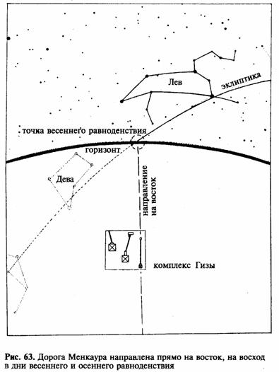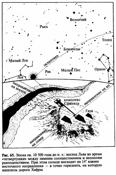 Компьютерная реконструкция древнего неба показывает, что если бы нам удалось совершать путешествие во времени и оказаться в 10 500 году до н. э. ровно посередине между зимним солнцестоянием и весенним равноденствием и, встав на «верхнем», то есть западном, конце дороги, ведущей к пирамиде Хафры, обратить свой взор вдоль нее на край «горизонта» Гизы, то на рассвете мы увидели бы следующее: