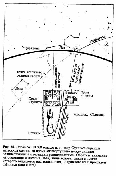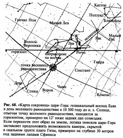 Карта сокровищМы уже Говорили, что в архитектурно-астрономической системе строителей пирамид положение точки весеннего равноденствия на эклиптике, которое называлось «славное место Первого Времени», определялось положением Осириса-Ориона на меридиане: «передвинь» Пояс Ориона вверх с его положения в 2500 году до н. э., и точка весеннего равноденствия «переедет» по эклиптике на запад (а по времени – вперед) в направлении «Телец -> Овен –> Рыбы -> Водолей»; «передвинь» его вниз, и точка весеннего равноденствия переедет на восток, то есть назад по времени, в направлении «Телец –> Близнецы -> Рак –> Лев. Таким образом, в 10 500 году, когда визир звезд Пояса максимально сдвинут вниз по отношению к горизонту, как далеко по эклиптике оказывается «отодвинутой» точка весеннего равноденствия? Мы знаем, что во Льва.