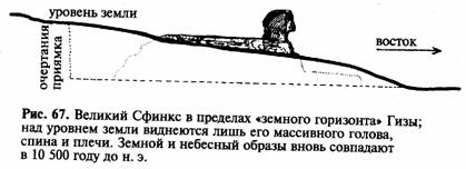 Как мы уже отмечали, у этого места имеется земной «двойник». Двойниками трех звезд Пояса Ориона служат три великих пирамиды. Созвездие Льва – Горахти имеет двойника в виде Гор – эм – Акхета, Великого Сфинкса. Земным двойником «горизонта неба» служит «горизонт Гизы». А Великий Сфинкс припал к земле буквально в пределах этого «горизонта».