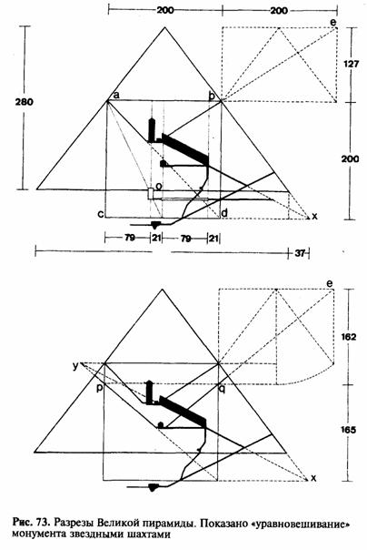 Если посмотреть на поперечное сечение пирамиды, то можно заметить, что каждый из двух комплектов «звездных шахт» – то есть северная и южная в камерах Царя и Царицы соответственно – задуман так, чтобы их выход находился на северной и южной гранях пирамиды на одной высоте. Они «висят», как гигантские плечи рычагов, как бы уравновешивающие всю геометрическую структуру пирамиды. Но имеется некая странность в размещении двух камер, от которых идут эти шахты. Если камера Царицы находится точно на центральной линии пирамиды, то камера Царя несколько смещена к югу, как будто для восстановления равновесия гигантских весов противовес был сдвинут влево.