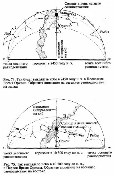 На рисунке 74 воспроизводится участок звездного неба 10 500 года до н. э. со звездой Аль-Нитак на меридиане. В этот момент, как мы видели в главе 17, точка весеннего равноденствия расположена прямо на востоке, чуть ниже Льва. «Противоположная» же ей точка осеннего равноденствия находится прямо на западе (чуть ниже Водолея). Короче говоря, в это время «два неба» – по одному с каждой стороны Млечного Пути – находились в идеальном равновесии, совершенно симметрично, как и описывается в текстах.